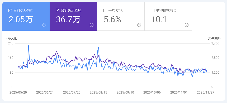 Google Search Consoleで半年間のPV以降を見てみると、一応グラフは超緩やかな右上がりになっている気がしますが、正直、伸び方は大した事が無く、横ばいに近い様に思えます。