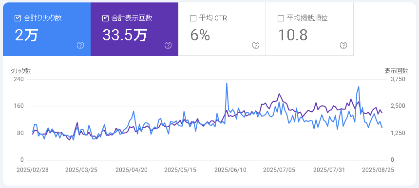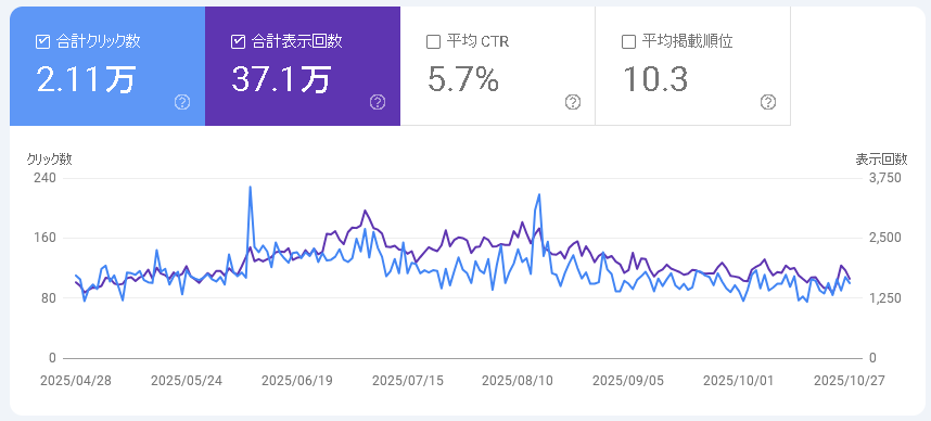 Google Search Consoleで半年間のPV以降を見てみると、一応グラフは超緩やかな右上がりになっている気がしますが、正直、伸び方は大した事が無く、横ばいに近い様に思えます。