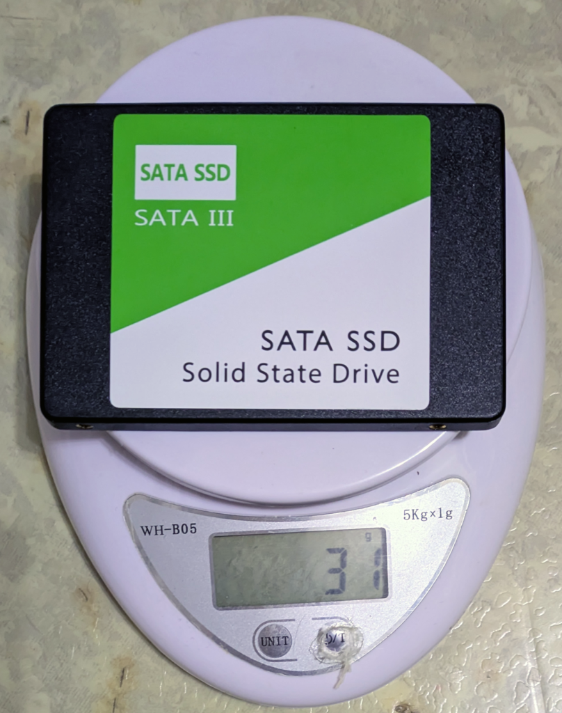 一見Western Digitalのようでありながらメーカー名がなく、ほぼパクリとしか思えない外観で、シールに赤・緑・青の3色が存在するタイプのSSDである。複数の容量があり、すべてが容量偽装とは限らないが、このデザインのSSDは間違いなく警戒すべきだ。