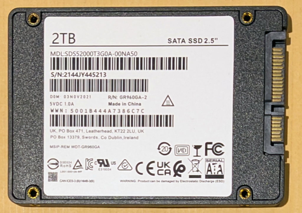 このPCに入っていたのは、緑シールの2TB SSDだった。