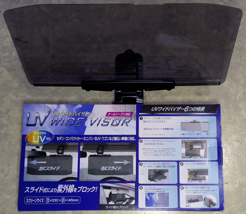 ダイソー サンバイザー(グレー/角度調整付・UVカット) | 220 円 | 塩化ビニル樹脂、吸収タイプ | 約120 | 約65 % | ミラーより劣るが十分実用 |