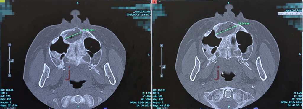 そして、2024年11月の再撮影時点では嚢胞は約3.25cmに縮小。この時点で、当初あった前歯のぐらつきは完全になくなっていました。